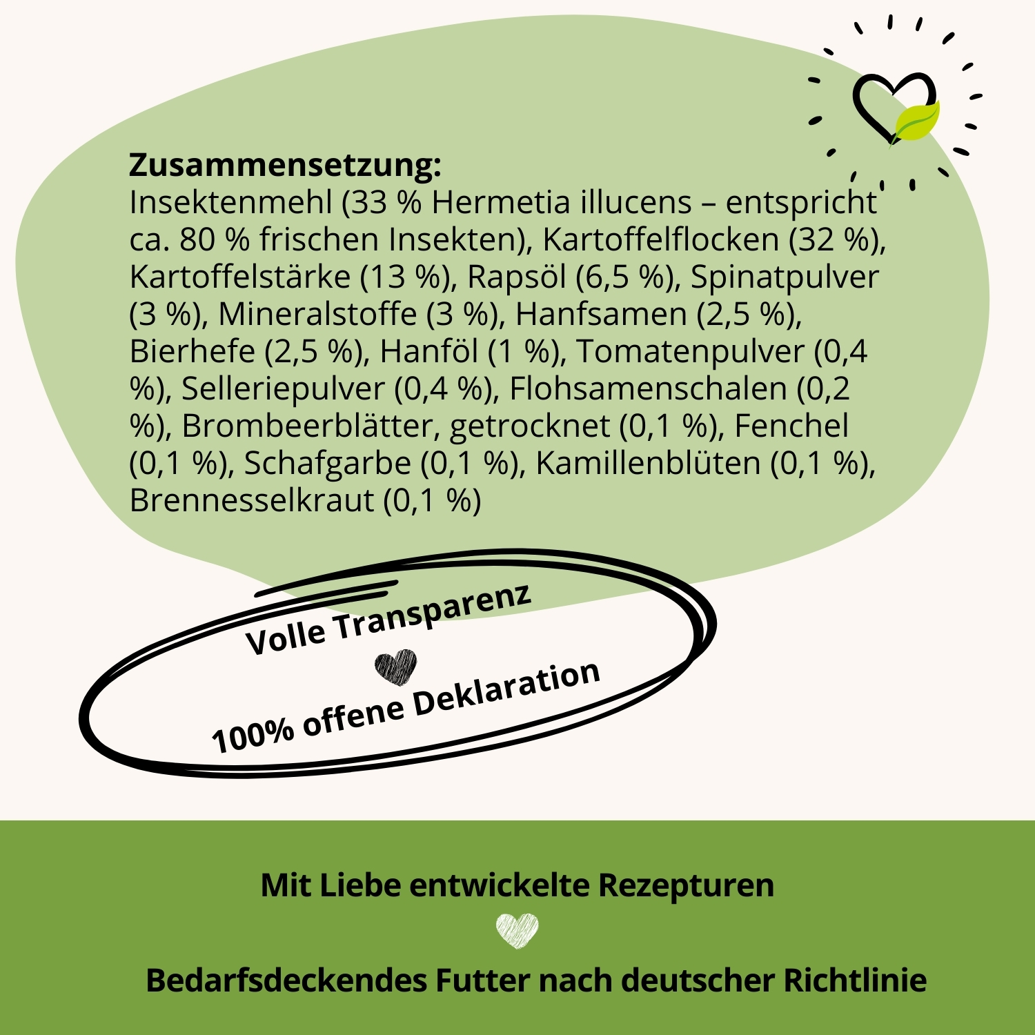 Zusammensetzung: Insektenmehl (33 % Hermetia illucens – entspricht ca. 80 % frischen Insekten), Kartoffelflocken (32 %), Kartoffelstärke (13 %), Rapsöl (6,5 %), Spinatpulver (3 %), Mineralstoffe (3 %), Hanfsamen (2,5 %), Bierhefe (2,5 %), Hanföl (1 %), Tomatenpulver (0,4 %), Selleriepulver (0,4 %), Flohsamenschalen (0,2 %), Brombeerblätter, getrocknet (0,1 %), Fenchel (0,1 %), Schafgarbe (0,1 %), Kamillenblüten (0,1 %), Brennesselkraut (0,1 %).*Hinweis: Die fehlenden Prozente zu 100% in der Zusammensatzung bestehen aus Wasser sowie Vitaminen und Spurenelementen.