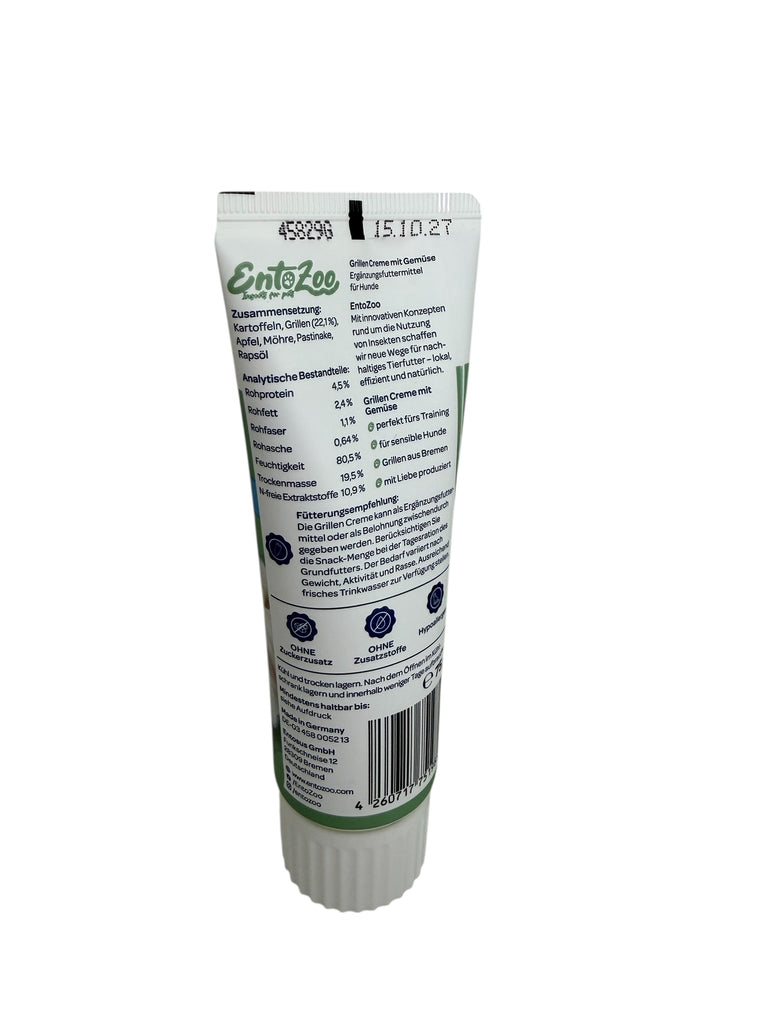 Die Grillen Creme kann als Ergänzungsfuttermittel oder als Belohnung zwischendurch gegeben werden. Berücksichtigen Sie die Snack-Mengebeider Tagesration des Grundfutters. Der Bedarf variiert nach Gewicht, Aktivität und Rasse. Ausreichend frisches Trinkwasser zur Verfügungstellen.