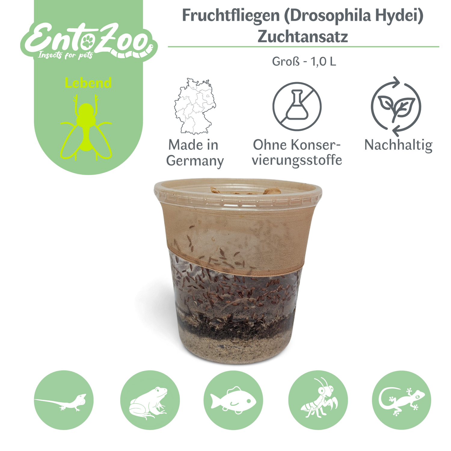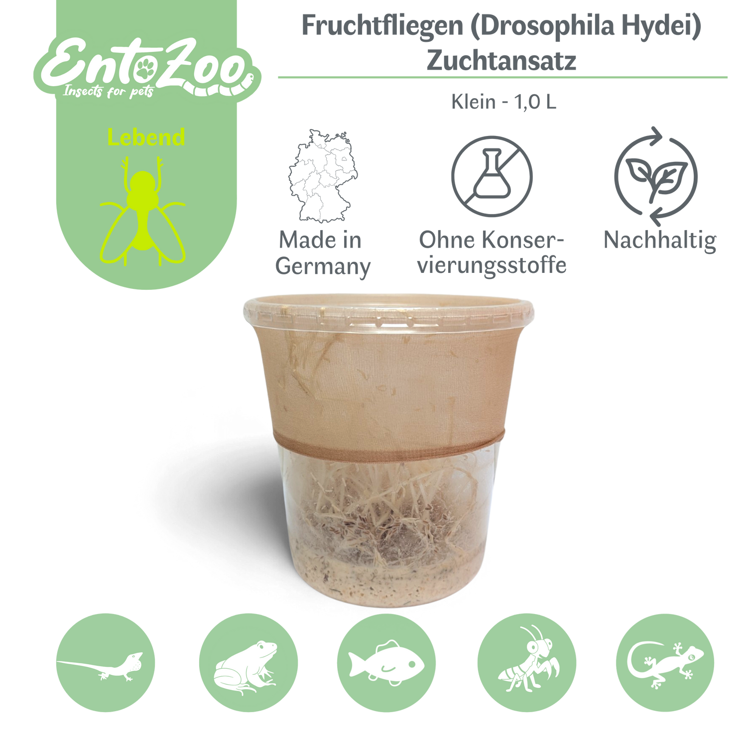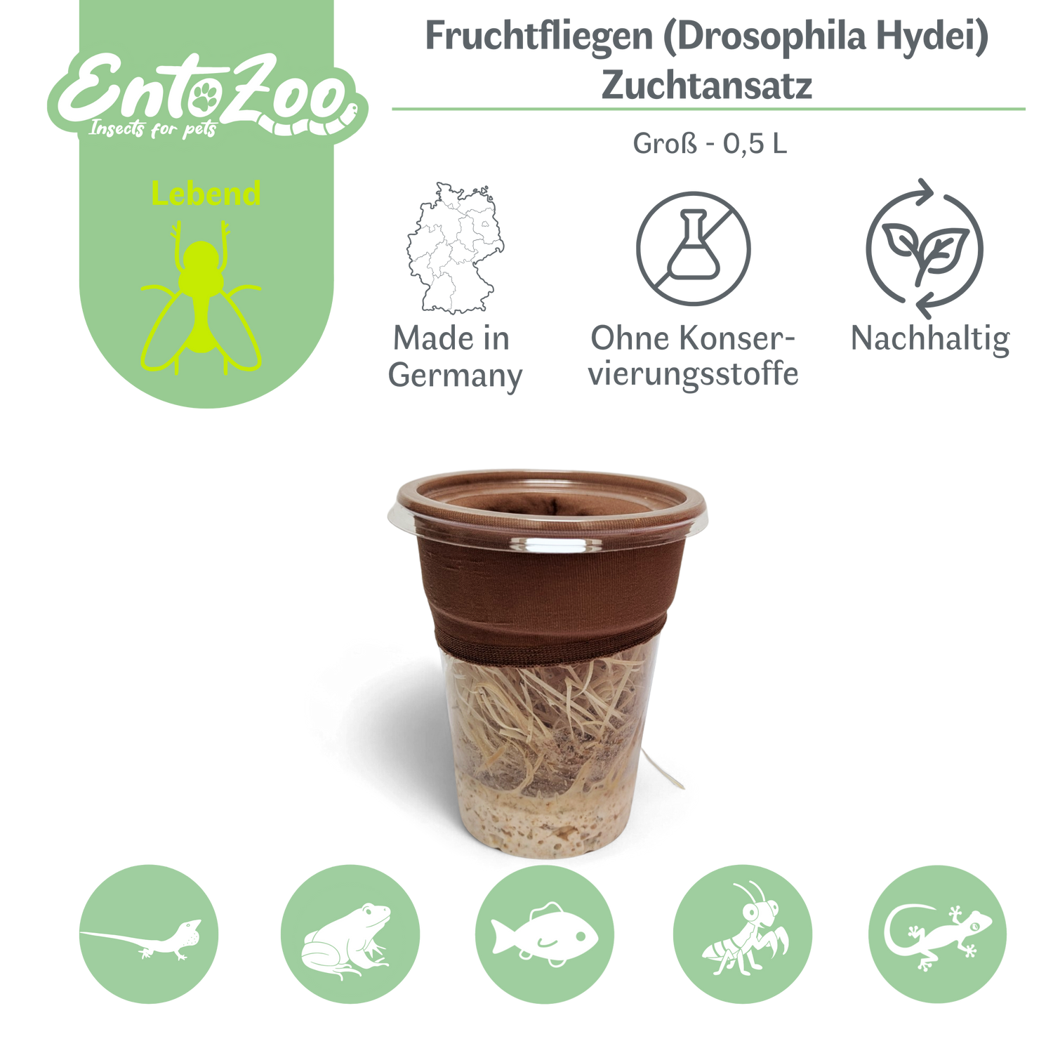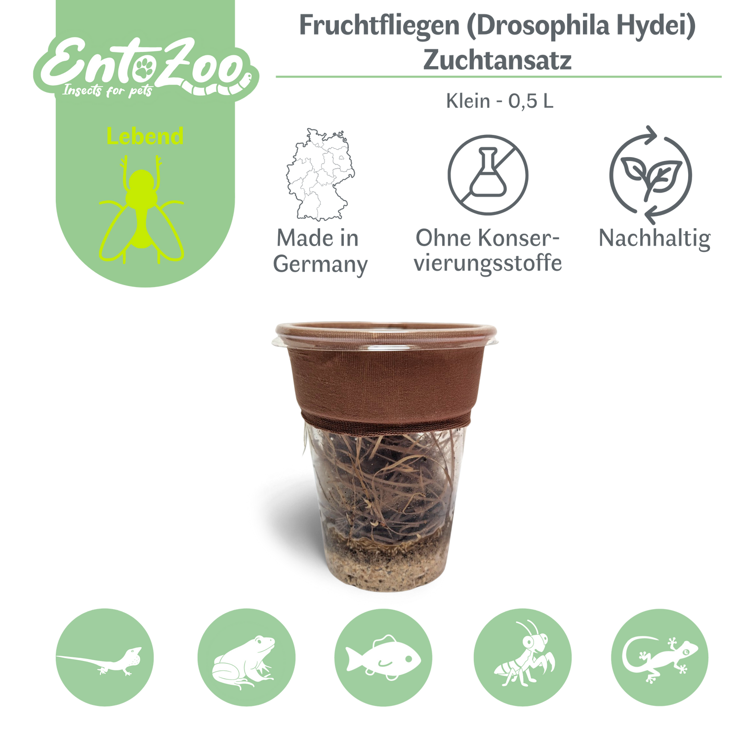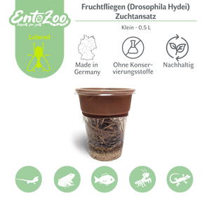 Fruchtfliegen (Drosophila Hydei) Zuchtansatz, Futterinsekten für kleine Tiere - Klein / 0,5 L