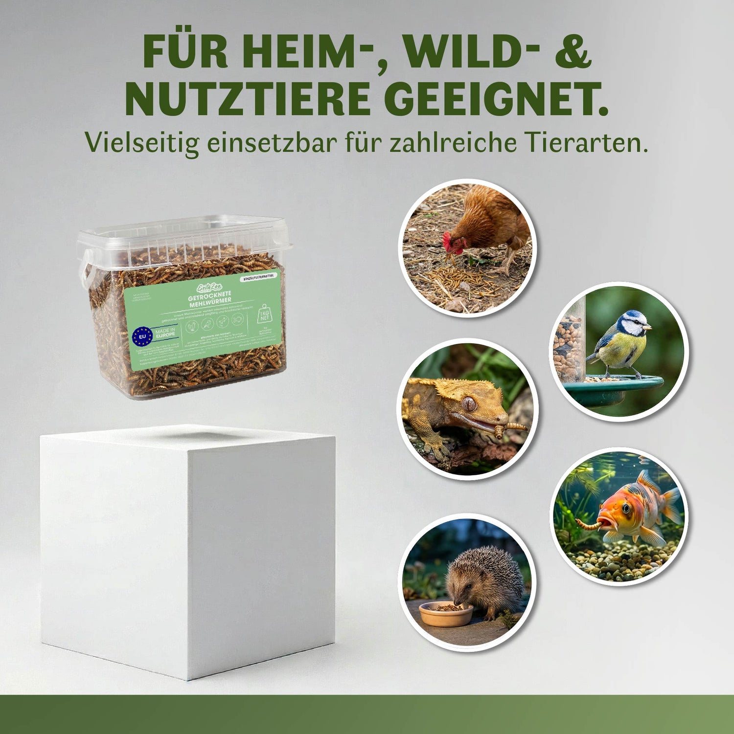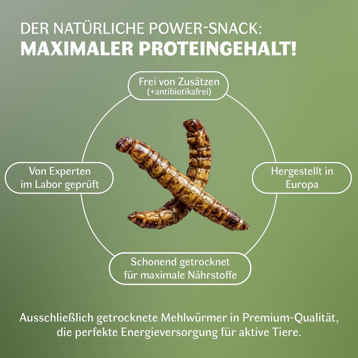 Hochwertige ProteinquelleGetrocknete Mehlwürmer sind reich an Eiweiß und gesunden Fetten – ideal für den Muskelaufbau und die Energieversorgung deiner Tiere. Zudem enthalten sie essentielle Vitamine und Mineralstoffe, die Gesundheit und Wohlbefinden fördern.