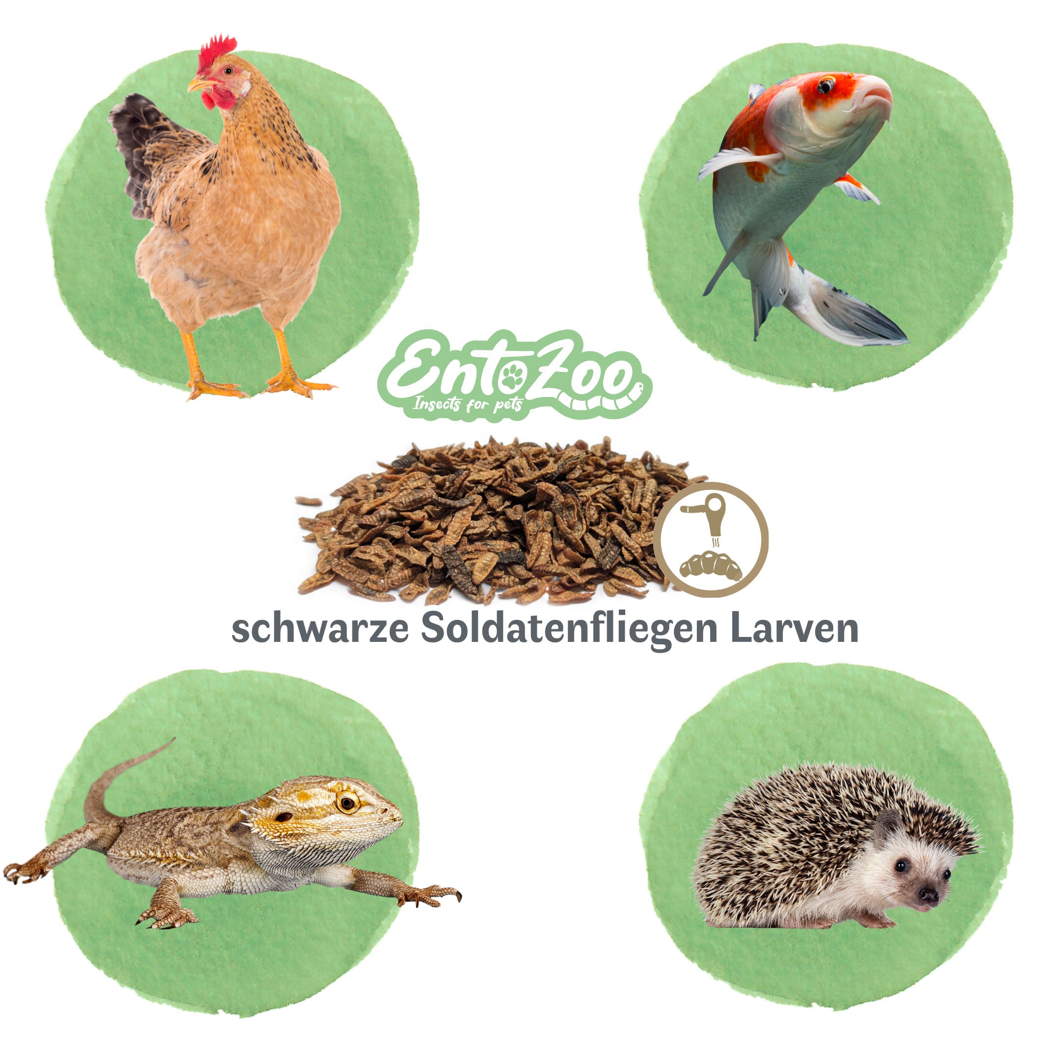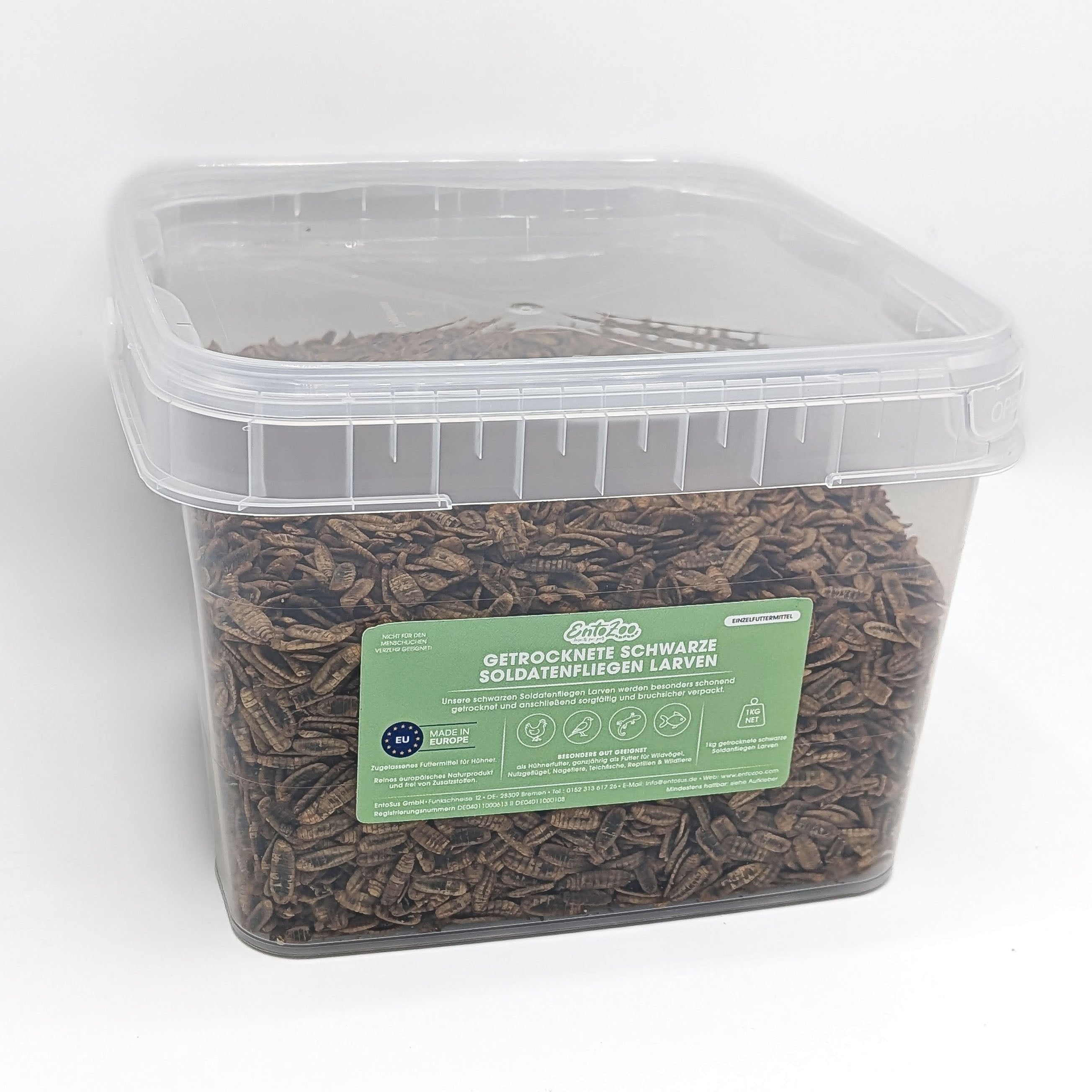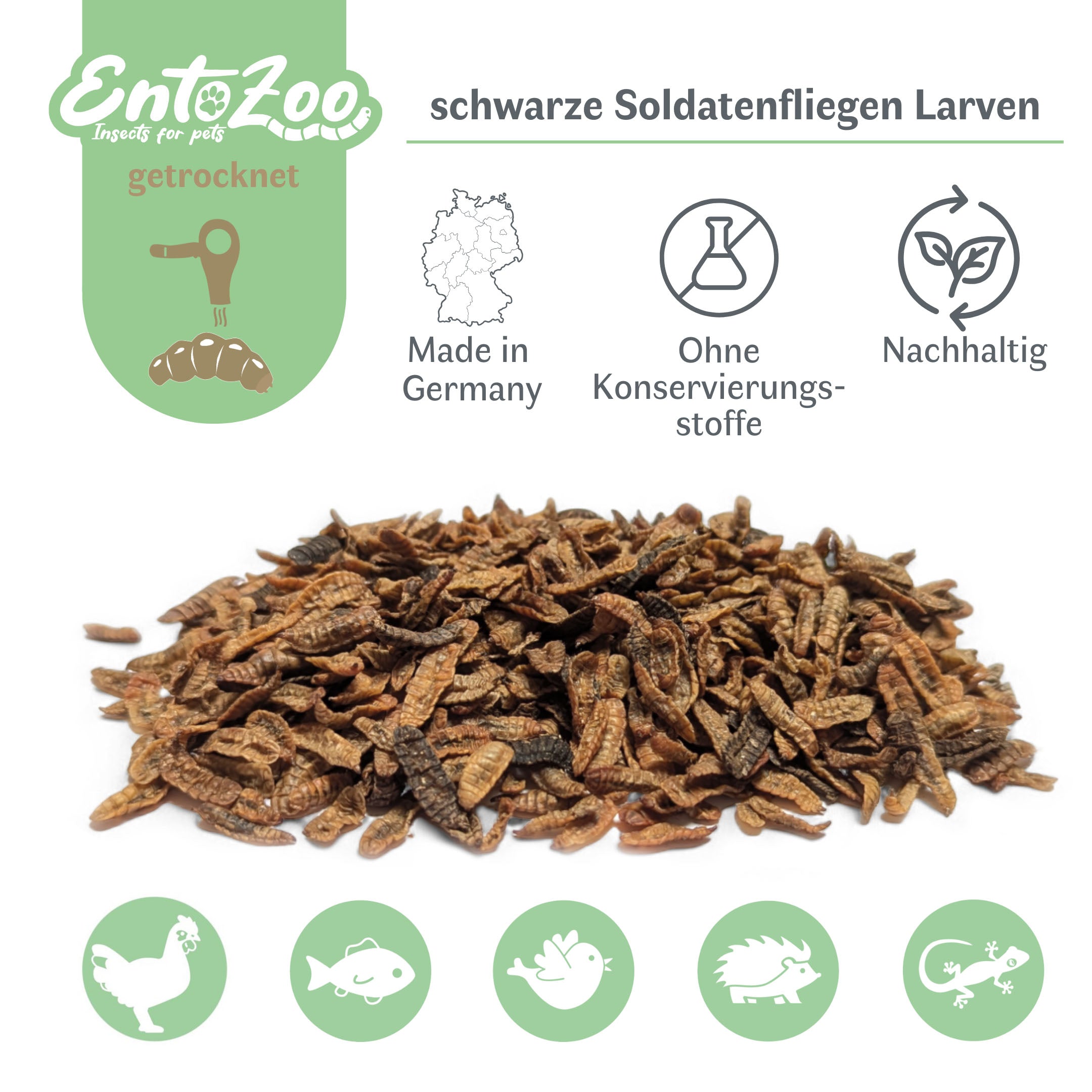 Bei EntoZoo legen wir nicht nur Wert auf die Gesundheit eurer Haustiere, sondern auch auf die Nachhaltigkeit unserer Produkte. Unsere getrockneten Schwarzen Soldatenfliegenlarven bieten eine umweltfreundliche und artgerechte Alternative für die Ernährung eurer pelzigen, gefiederten und geschuppten Freunde.
