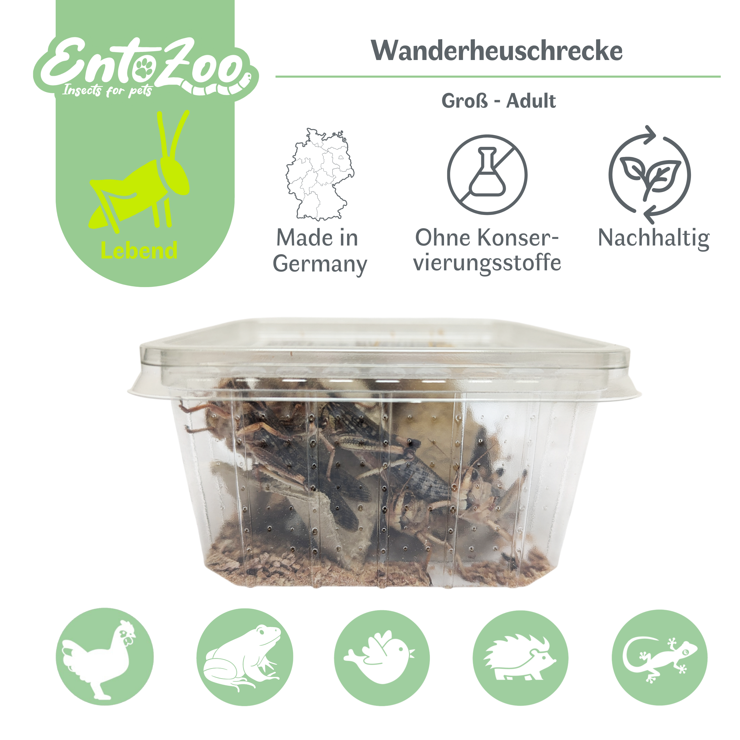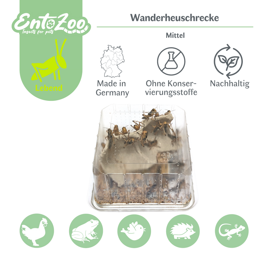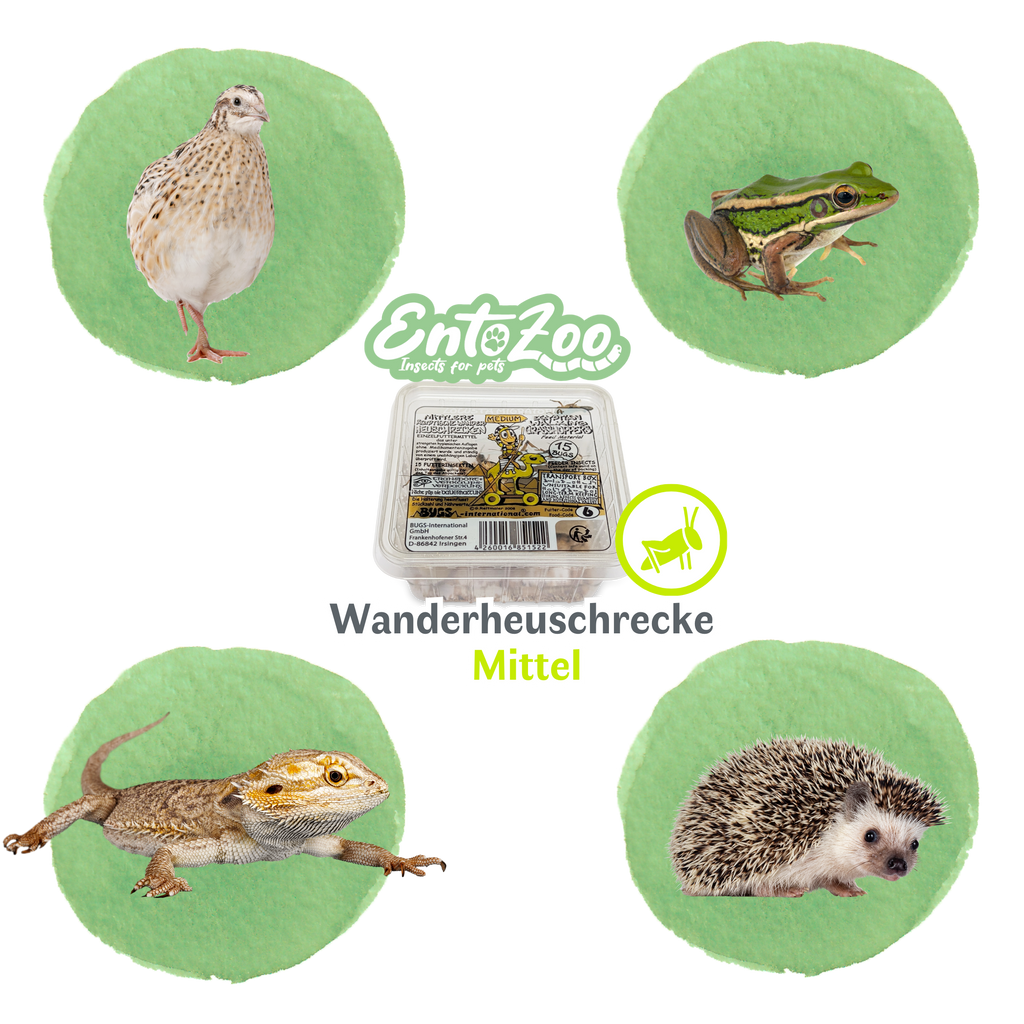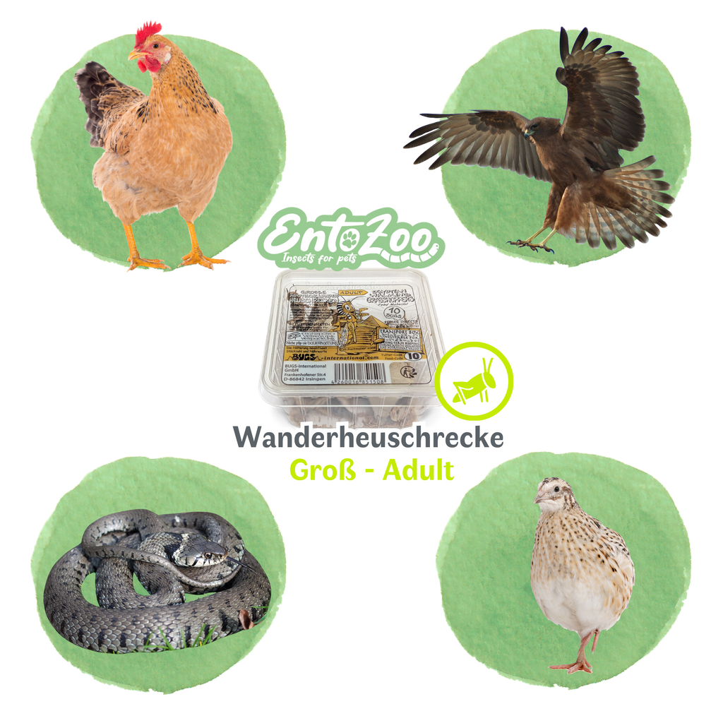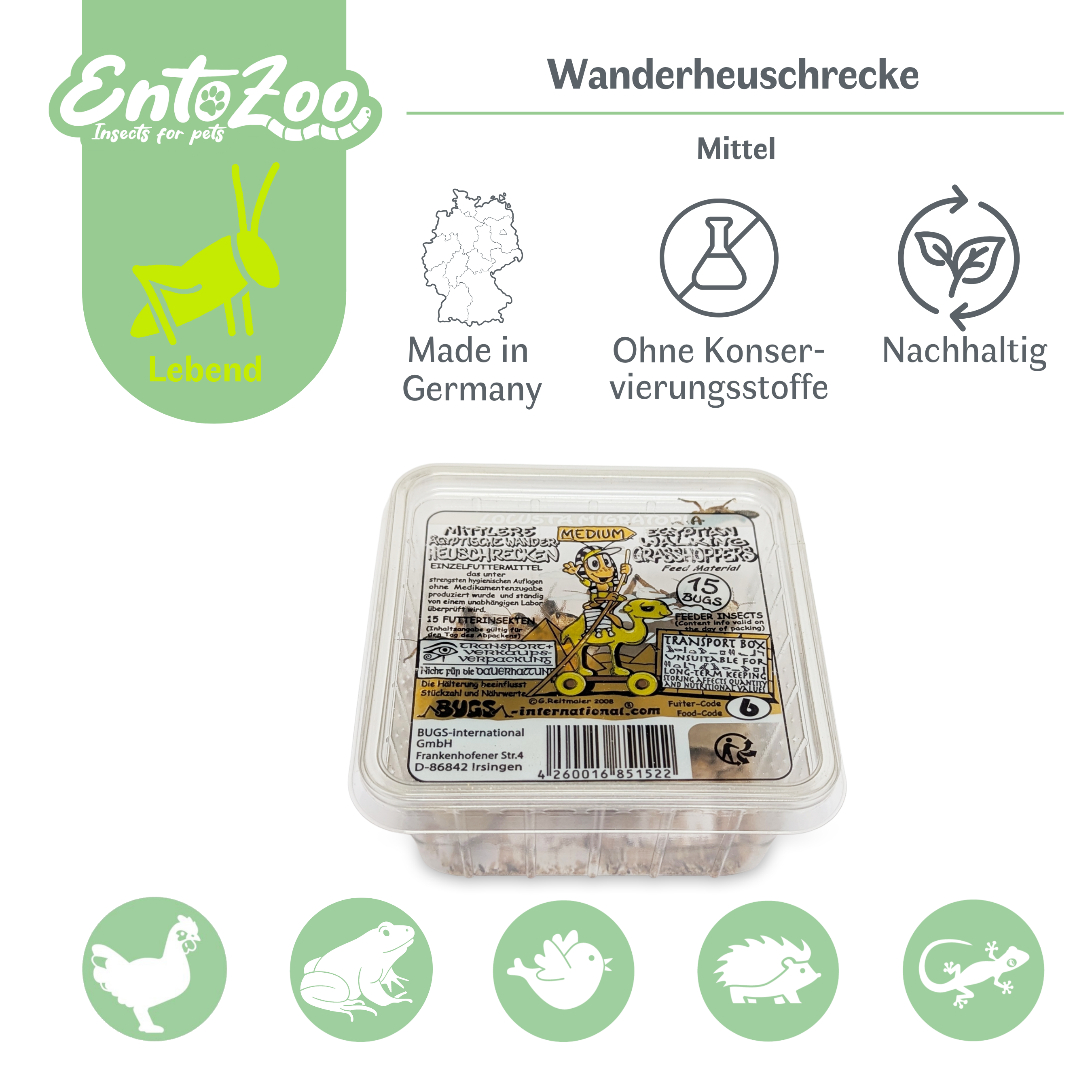 Die Ägyptische Wanderheuschrecke (Locusta migratoria) zählt seit Jahrhunderten zu den beliebtesten Lebendfutter-Insekten. Mit bis zu 6 cm Größe eignen sich die stattlichen Tiere hervorragend, um auch große Insektenfresser satt zu bekommen. Ihre lebhafte Fortbewegung löst bei vielen Reptilien, Amphibien, Vögeln und Kleinsäugern den natürlichen Jagdinstinkt aus – ein echtes Highlight im Futternapf.