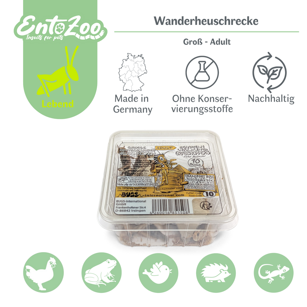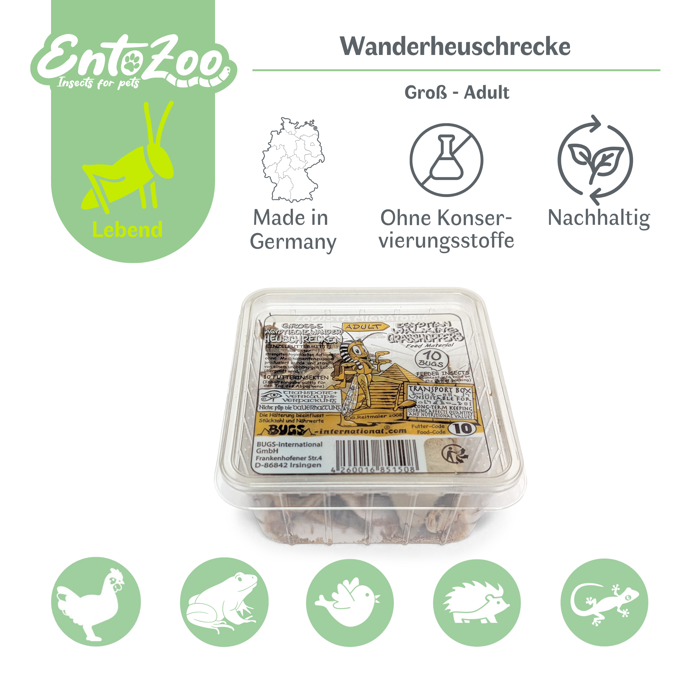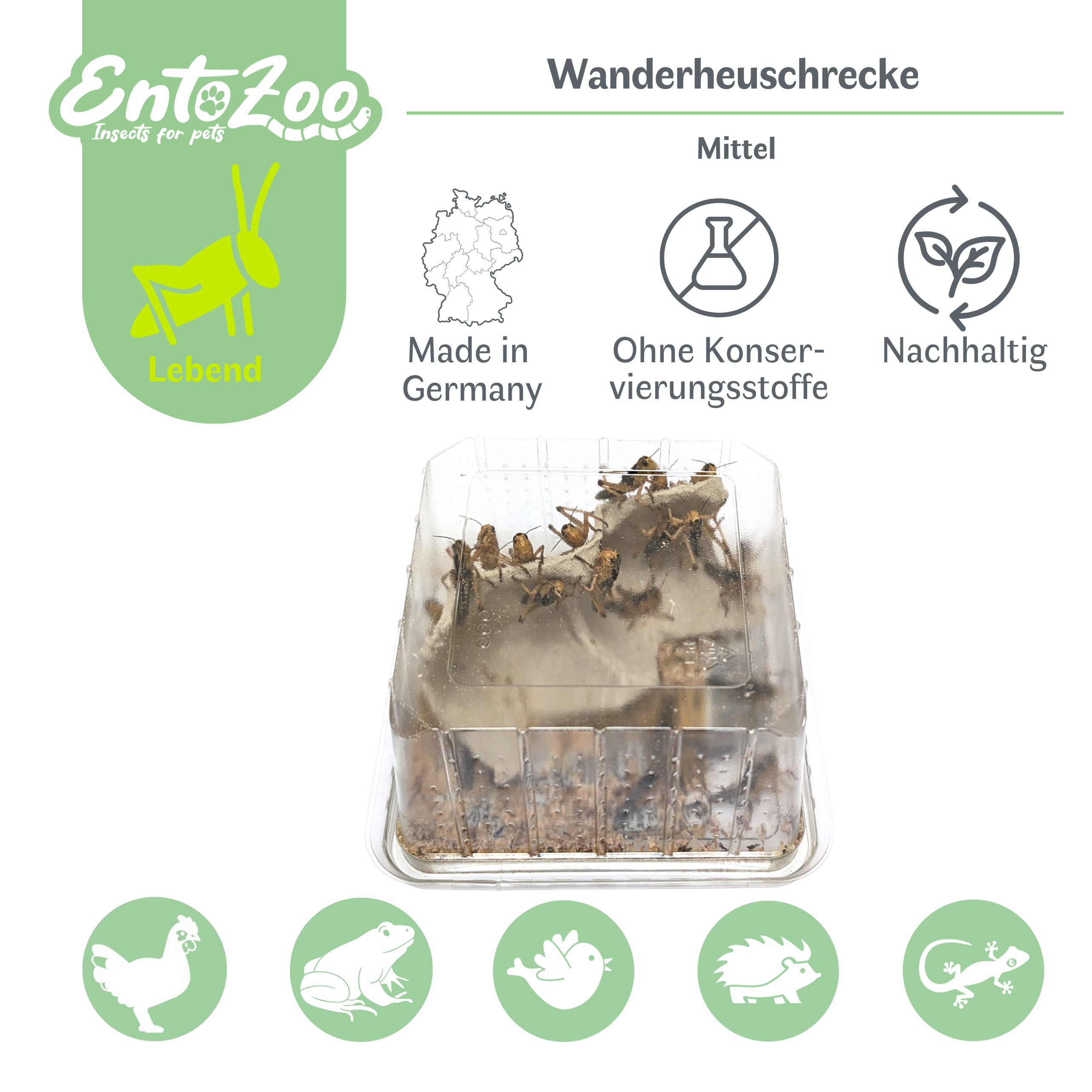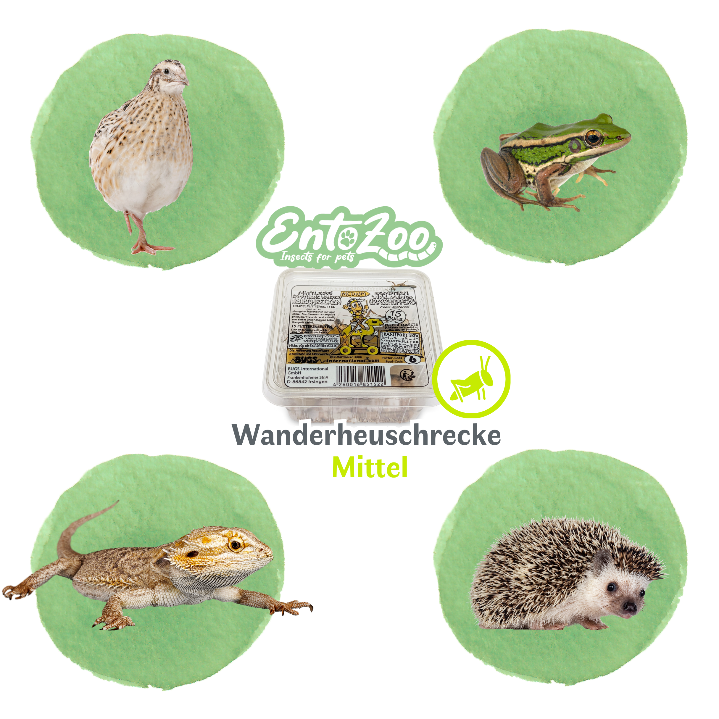 Die Ägyptische Wanderheuschrecke (Locusta migratoria) zählt seit Jahrhunderten zu den beliebtesten Lebendfutter-Insekten. Mit bis zu 6 cm Größe eignen sich die stattlichen Tiere hervorragend, um auch große Insektenfresser satt zu bekommen. Ihre lebhafte Fortbewegung löst bei vielen Reptilien, Amphibien, Vögeln und Kleinsäugern den natürlichen Jagdinstinkt aus – ein echtes Highlight im Futternapf.